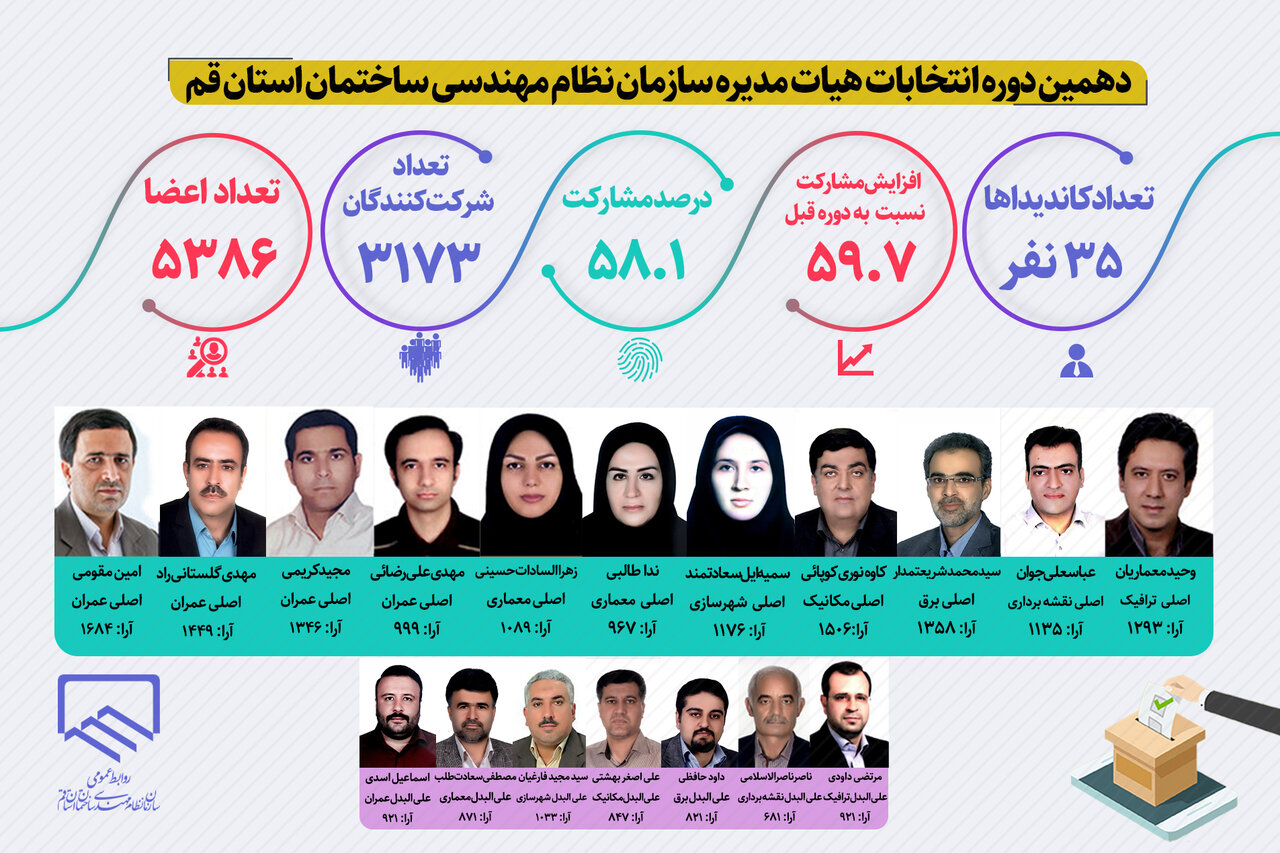 وی با اشاره به میزان مشارکت مهندسان در این دوره از انتخابات گفت: تعداد ۳۱۷۳ نفر از اعضای سازمان نظام مهندسی ساختمان استان قم در این دوره از انتخابات شرکت کردند و درصد مشارکت ۵۸.۱ درصد بوده است.