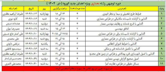 اطلاع رسانی دوره توجیهی رشته معماری ویژه اعضای جدیدالورود (دی ماه ۱۴۰۴)