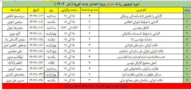 ۲.دوره مذکور جهت اعضایی می باشد که در آزمون های ورود به حرفه مهندسی قبول شده اند . لذا اعضایی که در آزمون ورود به حرفه قبول شده اند و همچنین اعضایی که در دور های قبل امکان حضور نداشتند در دوره مذکور شرکت فرمایند.